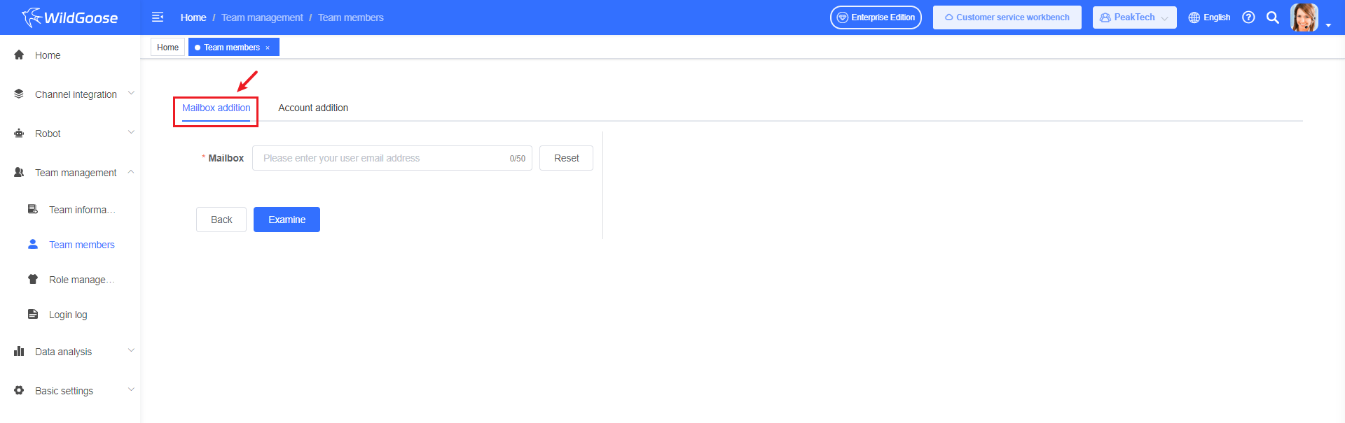 Click the [Add] button on the [Team Management]-[Team members] interface to add team members, and you can add team members through "Email" or "Account".